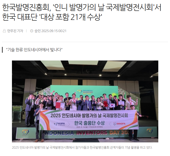 한국발명진흥회, '인니 발명가의 날 국제발명전시회'서 한국 대표단 '대상 포함 21개 수상'